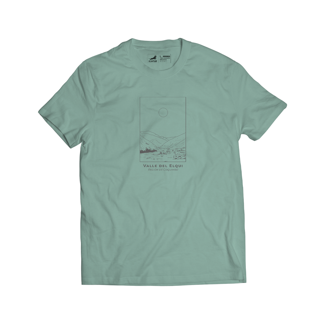 Esta polera lleva estampado en la parte frontal, un paisaje clásico del Valle, procurando dejar un gran espacio de cielo en la parte superior (obra de Michael Ramírez). En la paste posterior está estampado en un tamaño pequeño el logo Kuntur.